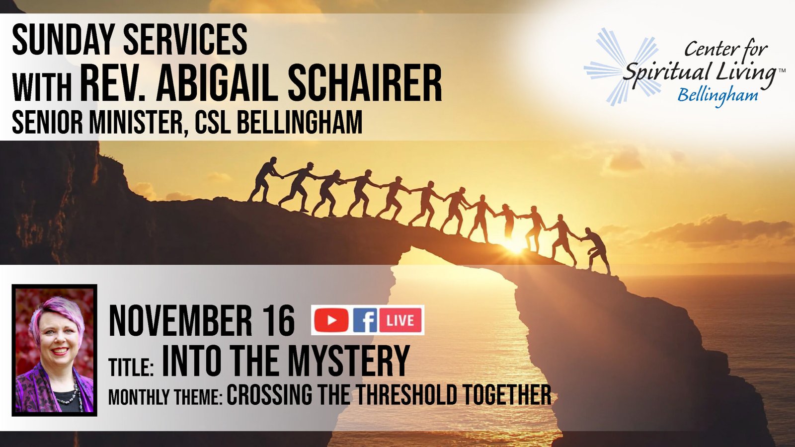 November 23 — Grateful for the Journey – Celebration Service Speaker: Rev. Abigail Schairer Gratitude transforms every ending and beginning into a blessing. As we move into Thanksgiving week, we’ll pause to honor the path we’ve traveled, the lessons learned, and the beauty of what’s yet to come. Join the Livestream (during Sunday Service)